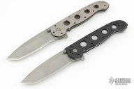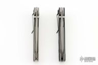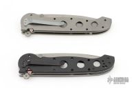 This M1614T from CRKT features a bead blasted spear point blade with partial serrations and dual thumbstuds. The handle has titanium scales over titanium liners and a black tip down pocket clip. Light scuffs/scratches are visible on the blade and handle otherwise the knife is in great condition.