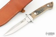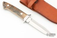 This Loveless Style Boot Knife by Mitch Jenkins features a mirror polished blade with false top edge, mirror polished stainless steel fittings, mammoth ivory scales with red liners, .200" blade thickness and .900" blade depth, full tapered tang. Excellent fit and finish. Comes with brown leather sheath. Excellent condition.