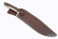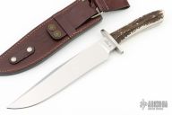 This knife by Boker features a satin finished clip point blade with a full tapered tang construction, .252" blade stock and 1.683" blade depth.  The handle has a steel guard, stag scales and red liners.  Includes a hand tooled brown leather sheath. Excellent Condition.