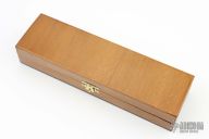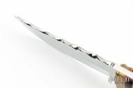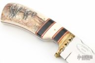 This fixed blade from Stephen Mackrill features a mirror finished drop point blade with fileworked spine, .201" blade stock and 1.453" blade depth, full tang construction. The handle has a file worked brass guard, red/black/brass spacers, pinned bone covers with scrimshaw by Mary Mueller. Comes with original buffalo hide sheath, wooden box and card. Has some patina, and some light scratches, otherwise excellent condition.