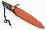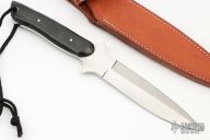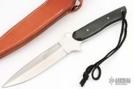 This F3-10 Combat/Utility Knife by Norm J Cohen features a mirror polished double edged blade with .189" blade stock and 1.230" blade depth, full tang construction. The handle has black canvas micarta scales. Has a few very light scratches, otherwise excellent condition. Comes with a brown leather sheath.