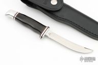 This knife by Buck features a satin finished blade with .119" blade stock and .628" blade depth, hidden tang construction. The handle has an aluminum guard and butt and wood grip. Comes with a black leather sheath and buck box. Excellent condition.