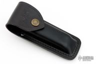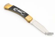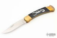 This Buck Model 110 features a satin finished clip point blade with a single nail nick. The handle has brass bolsters with integral liners and carved black pearled scales. Includes original box, and black leather belt sheath. Box is marked "Black Pearl Scorpion". Has some light scuffs, excellent condition otherwise.