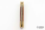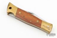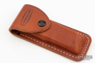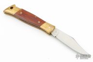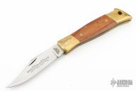 This lockback by Camillus features a satin finished blade with nail nick. The handle has brass bolsters, wood covers, brass liners, steel spring. Comes with original box, leather belt sheath and papers. Has patina, scratches, great condition otherwise.