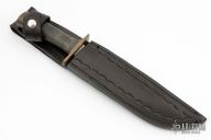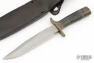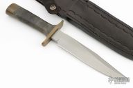 This fighter by JG Reeves features a bead blasted blade with sharpened top edge, .253" blade stock and 1.217" blade depth, hidden tang construction. The handle has a brass guard and butt with black canvas micarta grip. Comes with a hand tooled black leather sheath. Has a light spot on the blade infront of the makers mark, otherwise excellent condition.