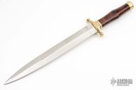 This dagger by "DRH" (please let us know if you know who this is) features a double edged mirror polished blade with .275" blade stock and 1.280" blade depth, hidden tang construction. The handle has a brass guard and butt with a cocobolo grip. Has some light scratches, otherwise excellent condition.
