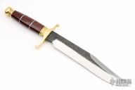 This bowie features a satin finished blade with forge finished flats and sharpened top edge, .238" blade stock and 1.638" blade depth, hidden tang construction. The handle has a brass guard and butt with a rosewood grip, aluminum spacers. Has some light scratches and a couple oxidation spots on the blade, otherwise good condition.