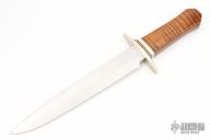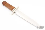 This bowie features a mirror finished blade with .216" blade stock and 1.333" blade depth, hidden tang construction. The handle has a nickel silver guard with black and brass spacers, curly koa wood grip. Has some light scratches and a couple oxidation spots on the blade, otherwise good condition.