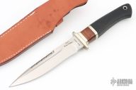 This Baby Hattori Fighter by Junglee Knives features a satin finished recurve blade with false top edge and partial serrations, .198" blade stock and 1.168" blade depth, hidden tang construction. The handle has a nickel silver guard with checkered rubber grip, nickel silver and wood spacers. Comes with a brown leather sheath. Has some light scratches and patina. Great condition otherwise.