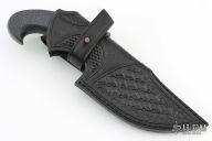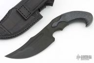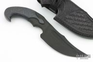 This Integral Keyhole by the Sobral Brothers features a parkerized blade with false top edge and fullers, .281" blade stock and 1.820" blade depth, integral keyhole construction. The handle has a carbon fiber grip. Comes with a hand tooled black leather sheath and a zippered case. Excellent condition.
