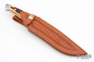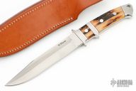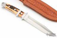 This Integral Sub-Hilt Fighter by Ricardo Velarde features a hand rub satin finished blade with a sharpened top edge, .187" blade stock and 1.033" blade depth, at the ricasso, full integral tapered tang construction. The handle has amber stag scales with red liners, fluted bolsters and butt, lanyard hole. Comes with a hand tooled brown leather sheath dated 2000 on the front, and a zippered case. Excellent condition.