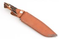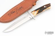 This Model 17 Fighter by John Young features a mirror polished blade with a sharpened top edge, .195" blade stock and 1.094" blade depth, full tapered tang construction. The handle has mirror polished double guard, amber stag scales with red liners, lanyard hole at the butt. Comes with brown leather sheath and a zippered case. Excellent condition.