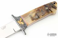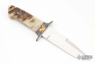 This Chute Knife by Chad nell features a mirror polished clip point blade with a sharpened top edge, .198" blade thickness and 1.332" blade depth, full tapered tang construction. The handle has a stainless steel guard that has been engraved with gold inlais by CJ Kai, sheep horn scales with thin red liners, engraved and gold inlaid stainless steel pins, has a lanyard hole. Excellent fit and finish. Comes with a zippered case. Excellent condition.