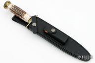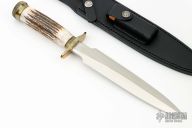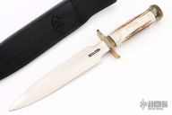 The Model 2-8 by Randall Made Knives is a heavily made dagger or dirk. brass guard, stag grip with nickel silver escutcheon, scalloped brass butt cap and collar, black spacers. Double-edged satin finished blade, .219" blade stock and 1.376" blade depth, hidden tang construction. Comes with a black leather sheath and a Randall zippered case. Excellent condition.