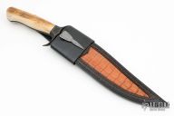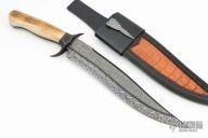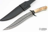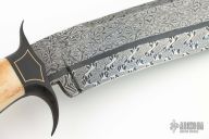 This fighter by Elio Neuhaus features a Mosaic Damascus blade with false top edge, .220" blade stock and 1.622" blade depth, hidden tang construction. The handle has a parkerized Mosaic Damascus guard with integral frame and mammoth ivory scales. The guard has gold inlaid engraving. Comes with a black leather sheath with Damascus frog stud and exotic leather inlay. Comes with a zippered case. Excellent condition. Truely stunning!