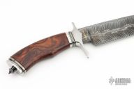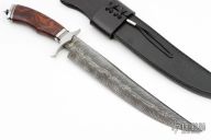 This fighter by Rafael Mendonca features a Feather Damascus blade with false top edge, .229" blade stock and 1.662" blade depth, hidden tang construction. The handle has a fluted stainless steel guard with a gold inlaid blued steel spacer, ironwood burl grip, fluted stainless steel butt with a gold inlaid blued steel spacer, blued steel tang nut with lanyard hole. Comes with a black leather sheath and a zippered case. Excellent condition. Stunning!