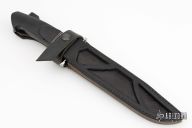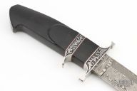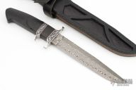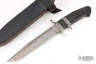 This Sub-Hilt Junior Bear Knife by Patrick Teyke features a stainless Damascus blade with a false top edge, .223" blade thickness and 1.222" blade depth, hidden tang construction. The handle has an engraved stainless steel double guard and sub-hilt, stabilized ebony grip and red spacers, has a stainless steel escutcheon on the spine of the handle with makers mark. Comes with a black leather sheath with exotic leather inlay and a zippered case. Excellent condition.
