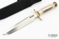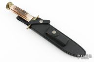 The Model 1-8 by Randall Made Knives has a brass guard, stag grip with nickel silver escutcheon, scalloped brass butt cap and collar, black spacers. Satin finished blade with sharpened top edge, .225" blade stock and 1.274" blade depth, hidden tang construction. Comes with a black leather sheath and a Randall zippered case. Excellent condition.