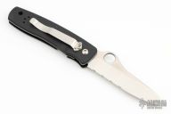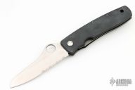 This Bob Terzuola designed knife from Spyderco has a satin finish partially serrated edge blade and black aluminum scales. Clip is interchangeable to up or down positions according to user preference. Comes with vintage white spyderco box, not model specific. Excellent condition.