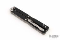 This Longhorse Balisong by Emerson knives features a clip point blade with wave feature and notched thumbrest. The handles have black G-10 scales with titanium liners and tip up clip, adjustable T-latch at the butt. Comes with original box. Excellent condition