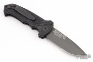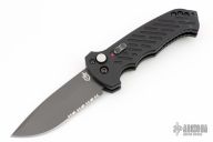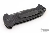 This 06 Side Opening Auto has a matte black finished S30V drop point partially serrated blade. The handle is black aluminum over black stainless steel liners, exposed stainless steel tang butt/ glass breaker/ backspacer with lanyard hole, black stainless steel tip up (RH/LH reversible) clip, and safety button. Light scuffs are visible on the frame otherwise the knife is in excellent condition. Comes with original box and papers.