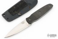 This Small Kinzhal fighter (#7792) has a satin finished CPM 154 spear point blade with full tang and notched thumb and finger rests. Blade width is just under 1/8", depth 1". Handle is black G10. Has a couple light scratches, otherwise excellent condition. Nice fit and finish. Very comfortable knife. Comes with black Kydex sheath.