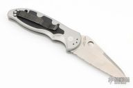 This Embassy from Spyderco features a clip point style blade with swedge, small thumb hole and notched thumb ramp. The handle has an aluminum frame with black G10 inlays. Lanyard hole in pommel. Reversible black coated stainless steel tip up clip. Blade is deployed via push button with fast coil spring action. Sliding safety on "A" side of handle. Has some light scuffs/scratches, otherwise excellent condition.