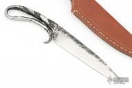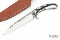 This knife by Forged in Patagonia features a hand forged blade with satin finished grinds and forge finished flats and handle, .215" blade stock and 1.217" blade depth. The handle is forged and twisted. Comes with a brown leather sheath. New from maker.