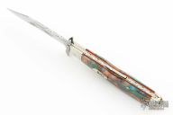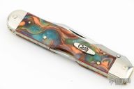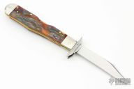 This D/A Auto Conversion Cheetah lock back folder from Case Knives features a clip point mirror polished blade with nail nick and fileworked spine. The handle has steel bolsters, front and rear, and swing guard, and the scales are acrylic over brass liners. Comes with a zippered case. Excellent Condition.