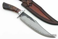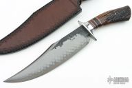 Another absolutely stunning piece from the Sobral brothers! This fighter features a San Mai Damascus blade with false top edge, .286" blade stock and 2.114" blade depth, hidden tang construction. The handle has a polished stainless steel guard and a beautiful stag grip with wood, stainless, and micarta spacers. This piece comes in an equally impressive, hand tooled, brown leather sheath and a leather zippered case. New from maker.