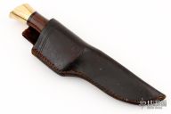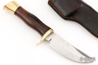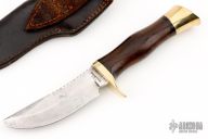 This knife by Browning Knives features a satin finished blade with notched thumbrest, .170" blade stock and 1.120" blade depth, hidden tang construction. The handle has a brass guard and butt, rosewood grip with black spacers. Comes with a brown leather sheath. Has some scratches, has been sharpened, has some patina, otherwise good user condition.
