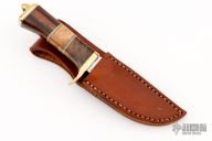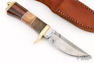 This Hunter by R.W. Wilson features a mirror polished blade with false top edge, .235" blade stock and 1.043" blade depth, hidden tang construction. The handle has a brass guard and butt, wood grip with white/grey/spacers. Has some scratches and oxidation, good user condition.
