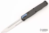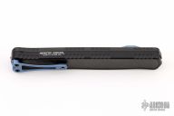 This Cleric II OTF by Heretic Knives features a stonewashed serrated tanto Magnacut blade with fullers. The handle has a black aluminum frame with carbon fiber cover, blue anodized finish titanium tip down clip and hardware. Comes with original box and lube. Excellent condition.