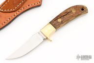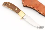 This knife by Al Scott features a mirror polished blade with .129" blade stock and .921" blade depth, full tang construction. The handle has a brass guard and mammoth ivory scales with black liners and brass pins. Comes with a brown leather sheath. Has a couple light scratches, otherwise excellent condition.