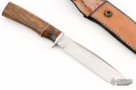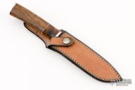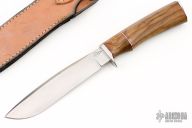 This Knife by Lee Reeves features a satin finished blade with .160" blade stock and 1.146" blade depth, hidden tang construction. The handle has a stainless steel guard, wood grip with a stainless steel butt. Comes with a brown leather sheath. #495 on the blade. Has a few light scratches and some patina on the blade, otherwise good condition.