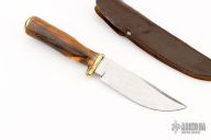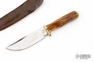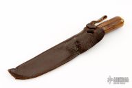 This Knife by William Rodgers features a mirror polished blade with fullers and a nearly sharpened top edge, .165" blade stock and 1.249" blade depth, hidden tang construction. The handle has a brass guard and butt, stag grip. Comes with a brown leather sheath. Has some scratches and light oxidation, otherwise good condition.