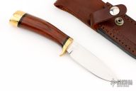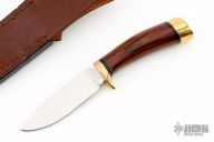 This knife by Browning Knives features a satin finished blade with .106" blade stock and .966" blade depth, hidden tang construction. The handle has a brass guard and butt, dymondwood grip with black spacers. Comes with a brown leather sheath. Has a few light scratches, otherwise excellent condition.