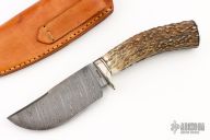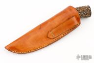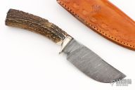 This knife by Steve Poweres features a Damascus blade with false top edge, .155" blade stock and 1.609" blade depth, hidden tang construction. The handle has a nickel silver guard and butt, stag grip with black and nickel silver spacers. Comes with a brown leather sheath. Has some light scratches, otherwise excellent condition.