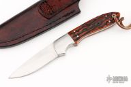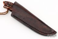 This knife by Blume Knives features a satin finished blade with .121" blade stock and .938" blade depth, full tang construction. The handle has dovetailed stainless steel bolsters, jigged bone scales with red liners. Comes with a brown leather sheath. Has some scratches, otherwise good condition.