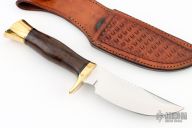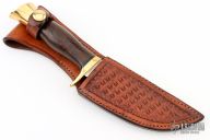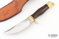 This knife by Browning Knives features a polished blade with notched thumbrest, .172" blade stock and 1.236" blade depth, hidden tang construction. The handle has a brass guard and butt, rosewood grip with black spacers. Comes with a brown leather sheath. Has some scratches, otherwise good condition.