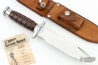 This Survival Knife by Garcia features a mirror finished spear point blade with sawteeth on the spine, .143" blade stock and 1.454" blade depth, hidden tang construction. The handle has an aluminum guard, stacked leather hollow handle and removable aluminum butt cap, has storage area in handle. Has a brown leather sheath. Has some scratches, good condition otherwise. Comes with original papers.
