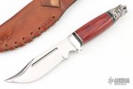 This knife features a mirror polished blade with false top edge and cut out fuller, .182" blade stock and 1.456" blade depth, hidden tang construction. The handle has an aluminum guard, dymondwood grip with black/nickel silver spacers, bear head pommel. Comes with a hand tooled brown leather sheath. Has a few light scratches, otherwise excellent condition.