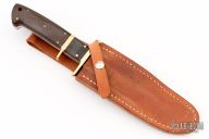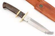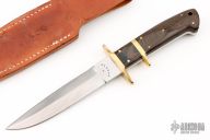 This Sub-Hilt Fighter by Enedino De Leon features a satin finished double edged blade, .206" blade stock, 1.085" blade depth, full tang construction with brass guard, sub-hilt and lanyard tube and linen micarta handle with white liners. Excellent work. Includes leather sheath with belt loop. Excellent condition.