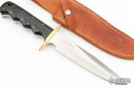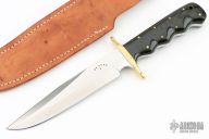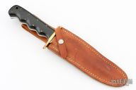 This VN Fighter from Enedino De Leon features a satin finished blade with sharpened top edge, full tang construction with .212" blade stock and 1.316" blade depth. The handle has a brass guard, green canvas micarta scales, white liners. Includes a brown leather sheath. Excellent condition.