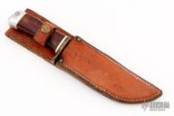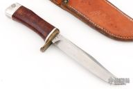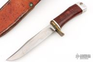 This Hunter by Baker Forged Knives features a satin/polished blade with .259" blade thickness and .94" blade depth, hidden tang construction. The handle has a brass guard and aluminum butt, stacked leather grip with aluminum spacers. Comes with a brown leather sheath and 1972 pamphlet. Has some scuffs, scratches, and patina. Good condition.