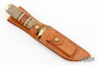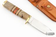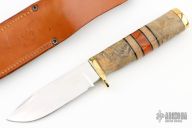 This hunter by Jim E Parker features a mirror polished blade with .131" blade thickness and 1.320" blade depth, hidden tang construction. The handle has a brass guard and butt with a wood grip, brass/black/amber/oosic spacers. Comes with a brown leather sheath. Has a couple light scratches, otherwise excellent condition.