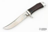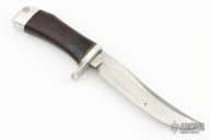 This Hunter by Baker Forged Knives features a satin/polished blade with .243" blade thickness and 1.083" blade depth, hidden tang construction. The handle has an aluminum guard and butt, stacked leather grip with brass spacers. Comes with a 1972 pamphlet. Has some scuffs, scratches, and patina. Good condition.