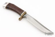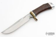 This Hunter by Baker Forged Knives features a satin/polished blade with .243" blade thickness and 1.095" blade depth, hidden tang construction. The handle has a brass guard aluminum butt, stacked leather grip with aluminum spacers. Comes with a 1972 pamphlet. Has some scuffs, scratches, and patina. Good condition.
