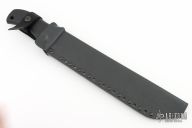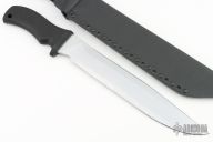 This Ogoun by Mad Dog has a 12” GTL finished blade, custom etching (aka Jolly Roger), custom black FR4 handle.  Sharpened top edge.  .25" Blade Stock.  1.859" Blade Depth.  All with the standard “Mad Dog” signature on the ricasso. Includes original kydex sheath. Excellent condition.