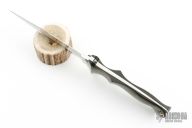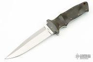 This knife by Leon Pittman features a mirror polished blade with false top edge, .183" blade stock and 1.039" blade depth, full tapered tang construction. The handle has black linen micarta scales and brass pins. Dated 1978. Has a few light scratches, otherwise excellent condition.